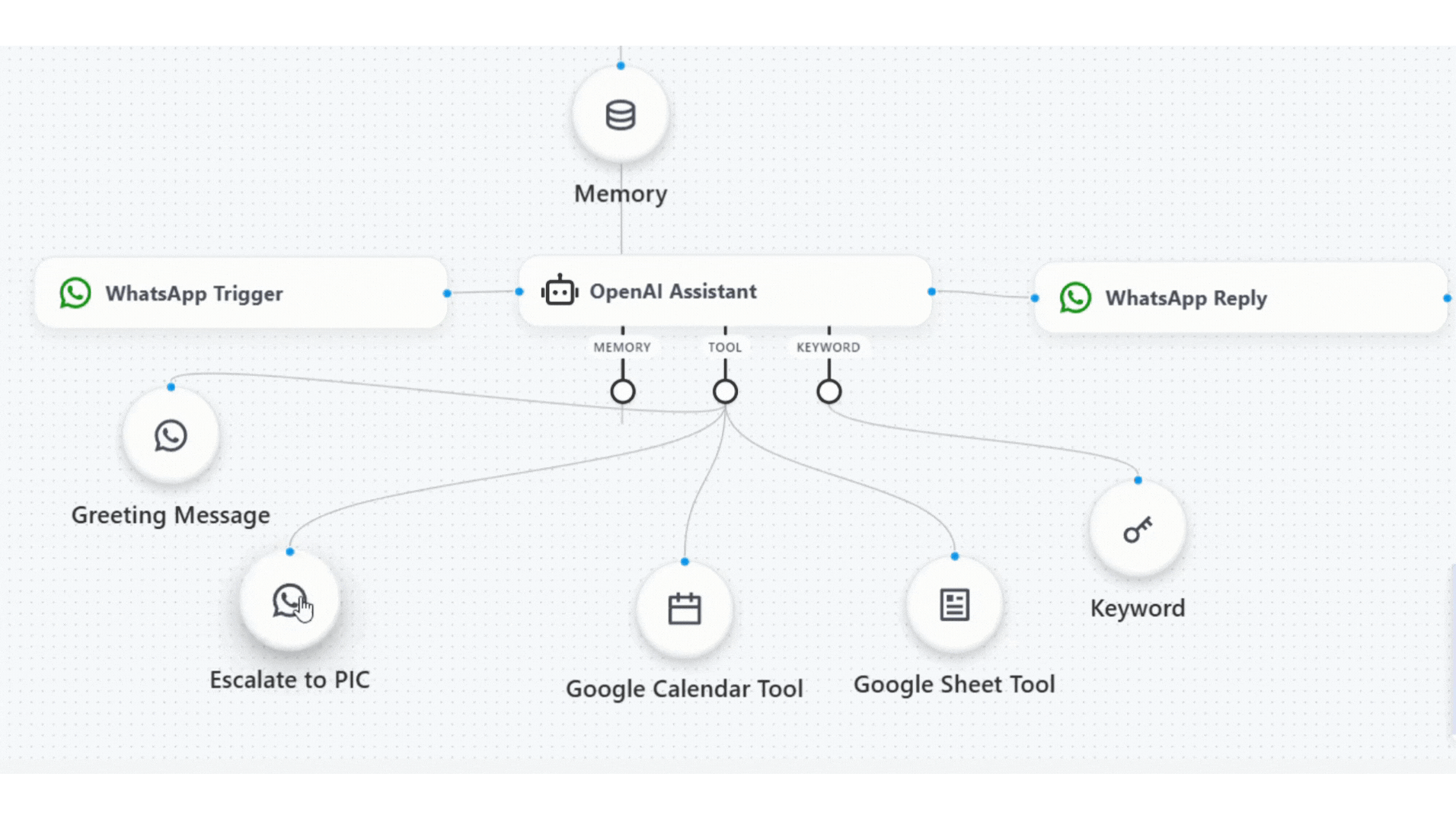 Our AI chatbot operates on a structured workflow rather than isolated replies. Incoming messages trigger an AI agent that uses memory, tools, and keywords to decide the next action, ensuring every conversation progresses intelligently.