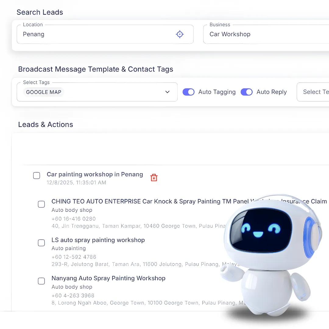 This Malaysia AI Chatbot automatically gathers potential customers for you. Simply type a location + keyword (for example: Penang; car workshop) and within minutes it generates a clean, downloadable list complete with company names, addresses, and phone numbers.
