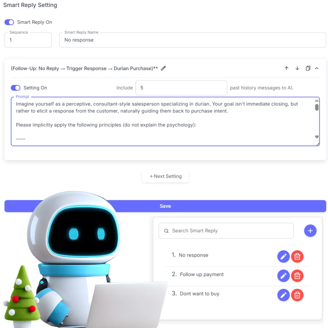 AI automatically generates ready-to-send replies based on past conversations and sales scenarios - no more thinking or typing from scratch.